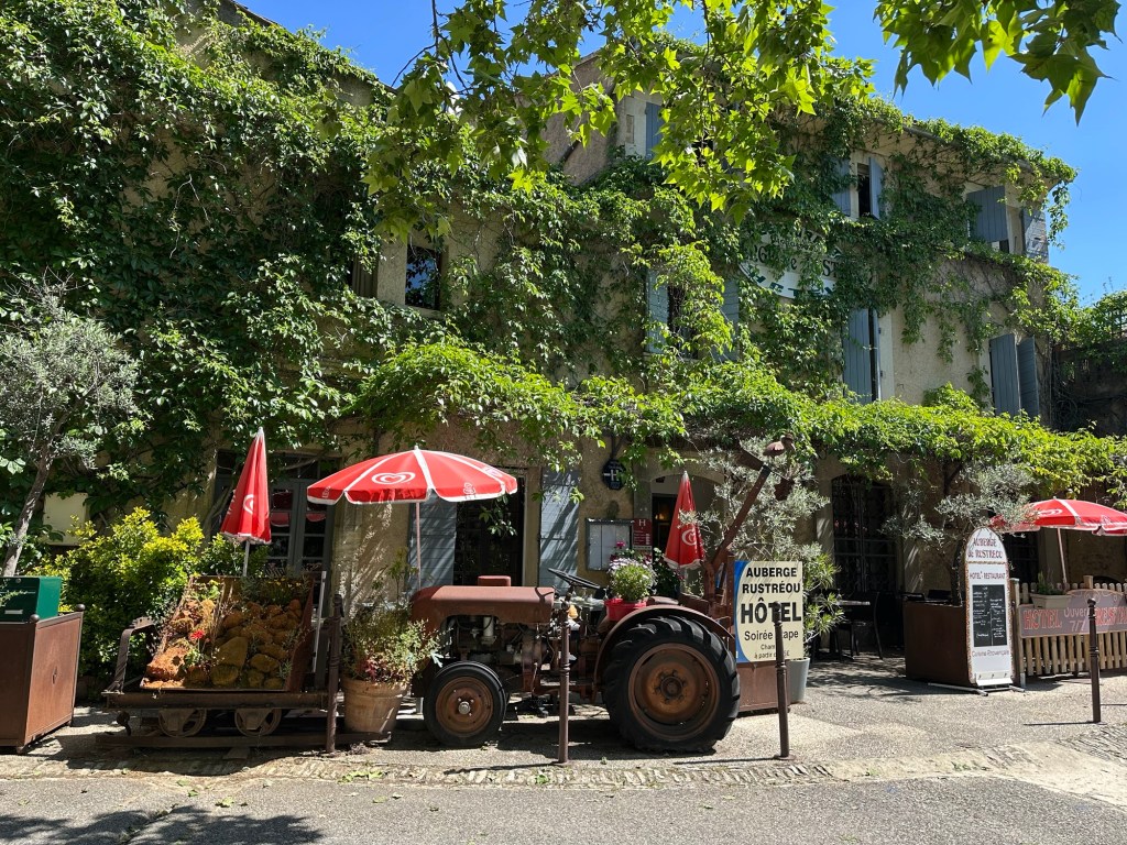 Heute fahren wir mit dem Motorrad zum Marché in Lourmarin. und essen genüsslich im Café Gaby. Die Brochette de Veau mit Spargelrisotto, das Omelette Roquefort mit Salat und Frites fait Maison sowie das Rhubarbe/Pomme Crumble zum Dessert sind ein Gedicht.